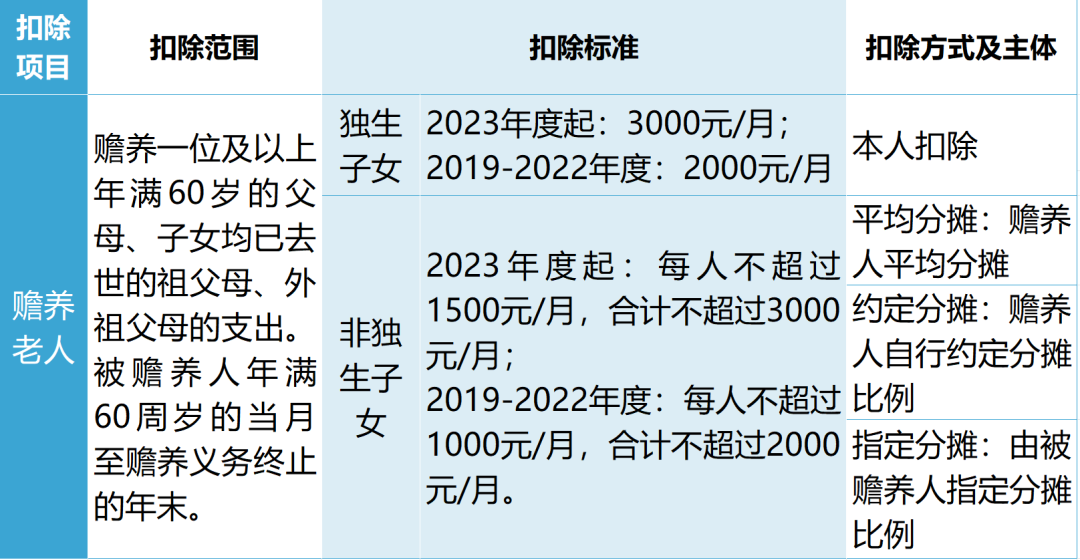 納稅人為非獨生子女的,每人每月扣除標準不能超過1500元,兄弟姐妹合計不超過3000元(2019-2022年度非獨生子女扣除標準每人不超過1000元/月,合計不超過2000元/月)。一個納稅年度內,如納稅人的其他兄弟姐妹均已去世,其可在第二年按照獨生子女3000元/月的標準扣除(2019-2022年度獨生子女的扣除標準為2000元/月)。