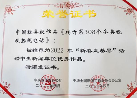 1.融媒體作品《接聽第308個冬奧會稅收熱線電話》榮獲中宣部、中國記協2022年“新春走基層”活動優秀作品獎。